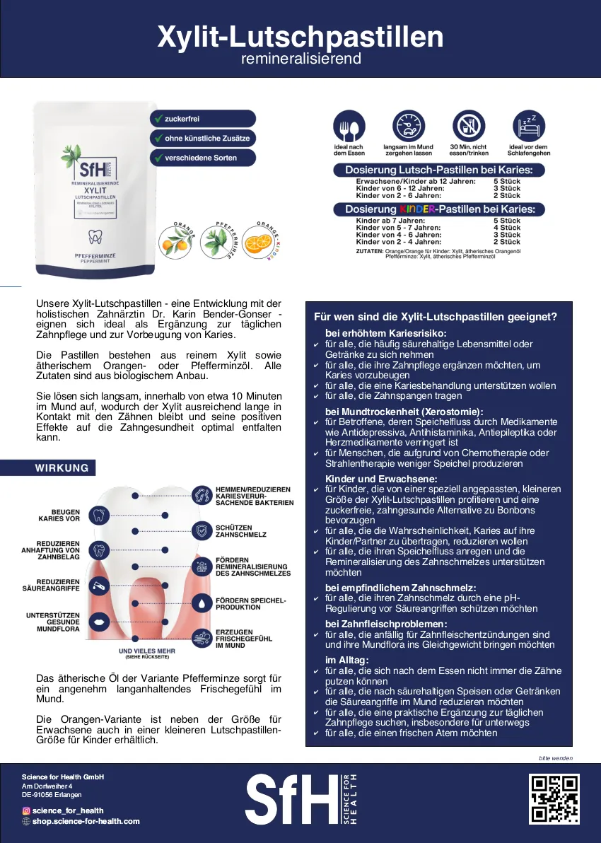 Die Xylit-Lutschpastillen langsam im Mund für ca. 10 Minuten zergehen lassen,