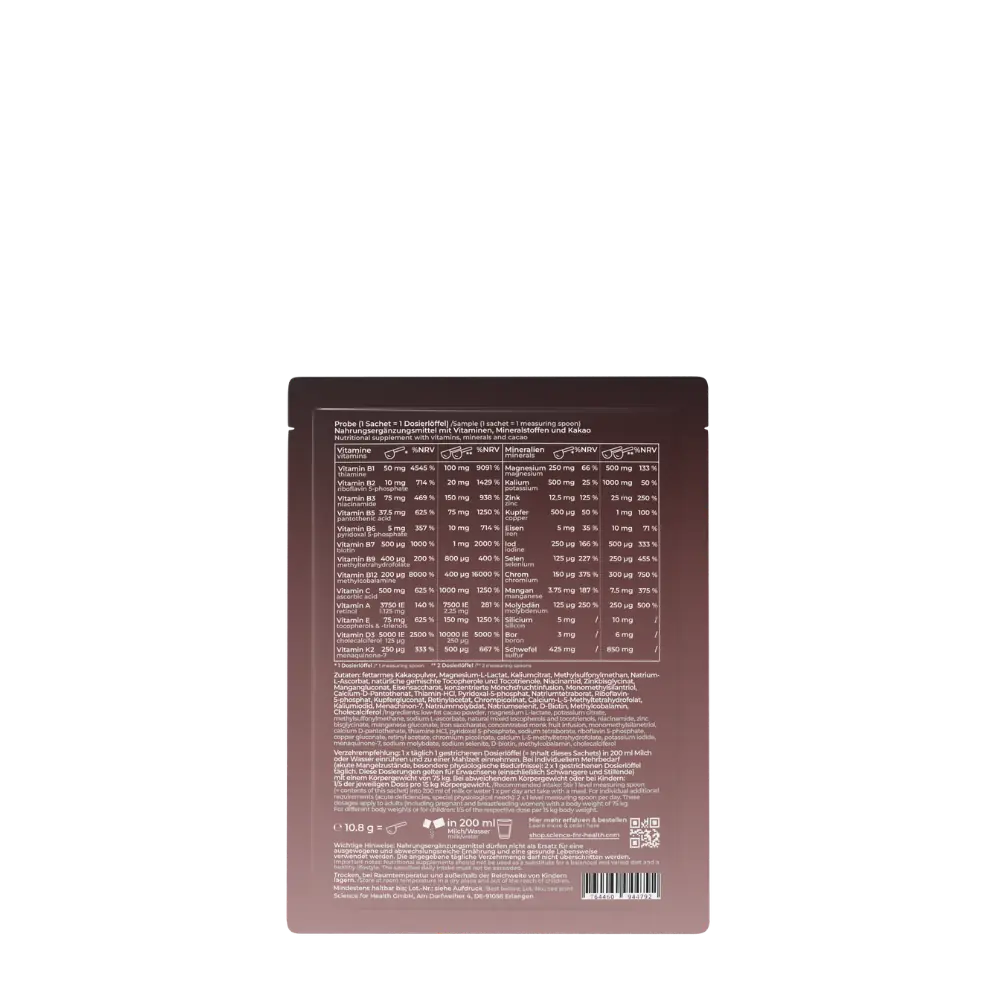 Hochwertiges Kakaopulver und Mönchsfruchtkonzentrat sorgen für einen angenehmen schokoladigen Geschmack und liefern sekundäre Pflanzenstoffe. Die ausgewogene Schokoladennote mit leichter Süße macht das Multi auch für Kinder geeignet und kommt dabei völlig ohne künstliche Aromen und Süßungsmittel aus.